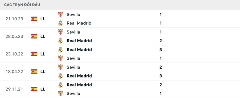 Thành tích đối đầu Real Madrid vs Sevilla