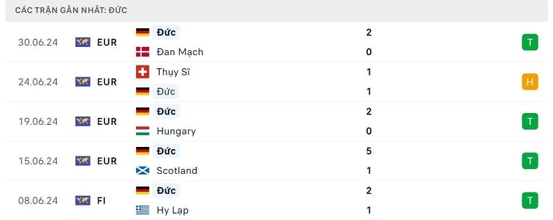 Dù không toàn thắng từ đầu giải như ĐT Tây Ban Nha nhưng tính đến thời điểm hiện tại, đoàn quân của HLV Julian Nagelsmann cũng chưa phải nhận thất bại nào (3 thắng, 1 hòa). ĐT Đức ghi được 10 bàn thắng và phải nhận 2 bàn thua.