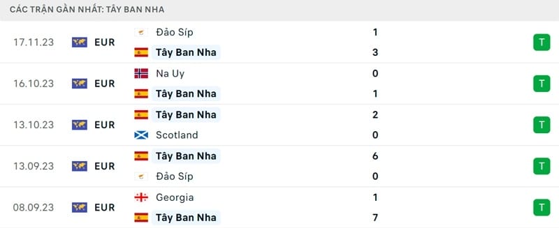 Trong khi đó, phong độ đội khách gần đây khá tệ. Họ chỉ thắng 1/5 trận vừa qua tại vòng loại EURO 2024, qua đó đang đứng áp chót bảng A. Trong 5 lần chạm trán giữa 2 đội gần đây tại các giải chính thức, Tây Ban Nha áp đảo hoàn toàn. Cụ thể, đội tuyển có biệt danh cuồng phong đỏ thắng cả 5 trận.