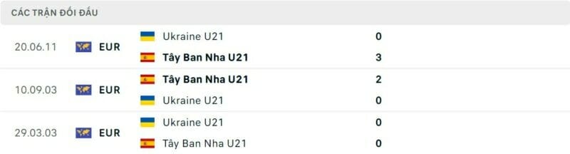 Thành tích đối đầu U21 Tây Ban Nha vs U21 Ukraine: