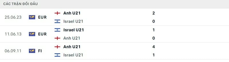Thành tích đối đầu U21 Israel vs U21 Anh