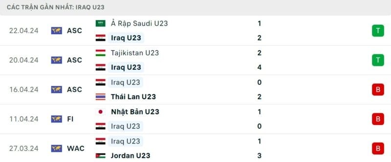 Phong độ gần đây U23 Iraq vs U23 Việt Nam