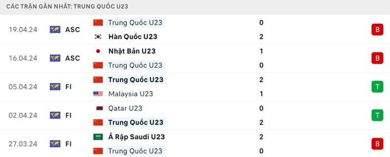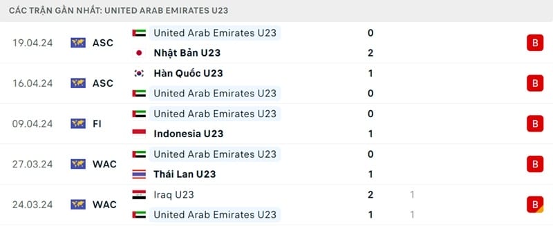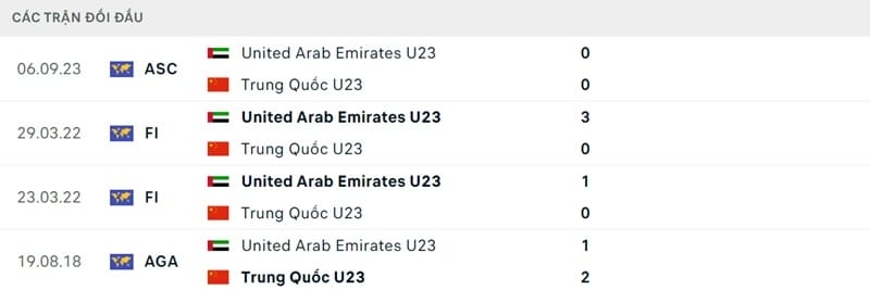 Thành tích đối đầu U23 UAE vs U23 Trung Quốc