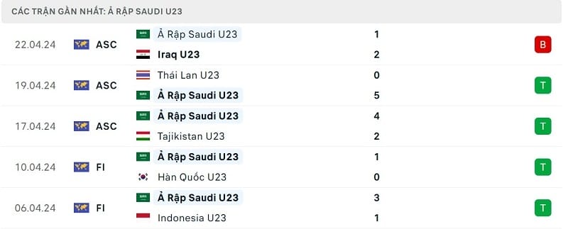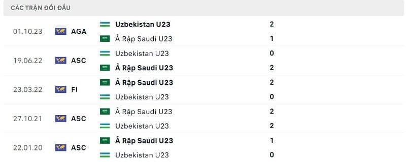 Thành tích đối đầu U23 Uzbekistan vs U23 Ả Rập Xê Út