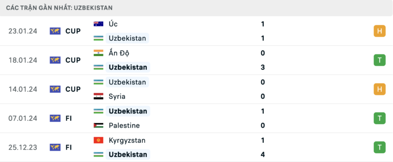 Thành tích đối đầu Uzbekistan vs Thái Lan