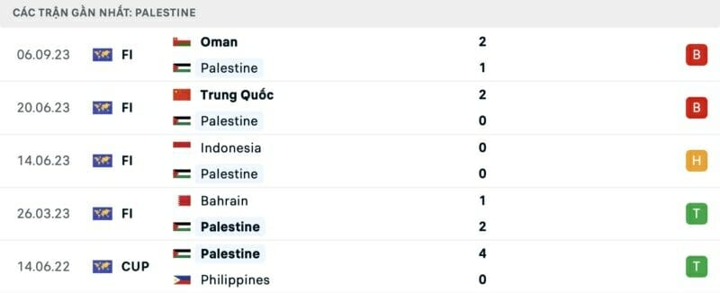 Đội khách đã không biết mùi chiến thắng trong 3 trận giao hữu gần nhất, bao gồm cả việc hòa Indonesia không bàn thắng hồi tháng 6. Sau đấy, họ liên tục nhận các thất bại trước Trung Quốc và Oman. Nhưng đó đều là các đối thủ chất lượng nên không thể đánh giá thấp Palestine.