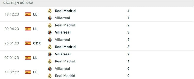 Thành tích đối đầu Villarreal vs Real Madrid