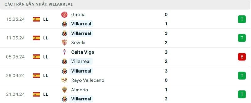Phong độ gần đây Villarreal vs Real Madrid
