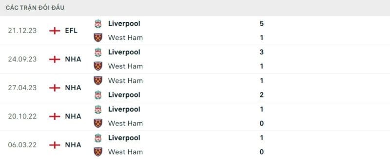 Liverpool đã toàn thắng trong 2 lần chạm trán West Ham mùa này, đó là trận thắng 3-1 tại Ngoại hạng Anh và thắng lợi 5-1 tại Carabao Cup. Vì vậy đây là đối thủ mà Lữ đoàn đỏ có thể tự tin giành chiến thắng nhằm xốc lại tinh thần sau chuỗi trận đáng quên.