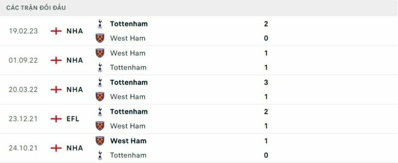Thành tích đối đầu West Ham vs Tottenham: