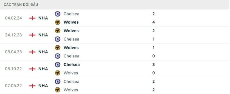 Thành tích đối đầu Wolves vs Chelsea