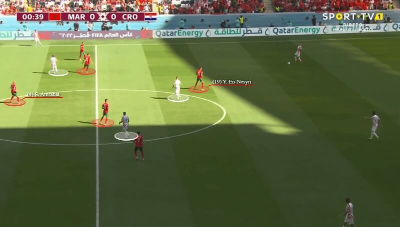 Ở ngày mở màn, Ma Rốc tập trung vào việc vô hiệu hóa bộ ba tiền vệ Luka Modric, Marcelo Brozovic và Mateo Kovacic. Trong sơ đồ 4-3-3, Youssef En-Nesyri thường xuyên điều chỉnh vị trí để cắt hướng chuyền bóng tới Brozovic. Ở đằng sau, Azzedine Ounahi và Selim Amallah theo kèm Modric và Kovacic. Như vậy, Sofyan Amrabat được tự do “trinh sát” và can thiệp nếu các đồng đội phía trên bị vượt qua.