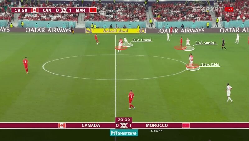 Sau 2 lượt đấu đầu tiên, đại diện của châu Phi chỉ cần có thêm 1 điểm là đủ điều kiện ghi tên vào vòng 1/8. Canada và sơ đồ 4-2-3-1 của họ cũng không thể làm khó thầy trò Regragui. Amrabat tiếp tục kèm 1v1, lần này là với Junior Hoilett, trong khi Ounahi và Abdelhamid Sabiri luôn để mắt tới Mark-Anthony Kaye và Jonathan Osorio.