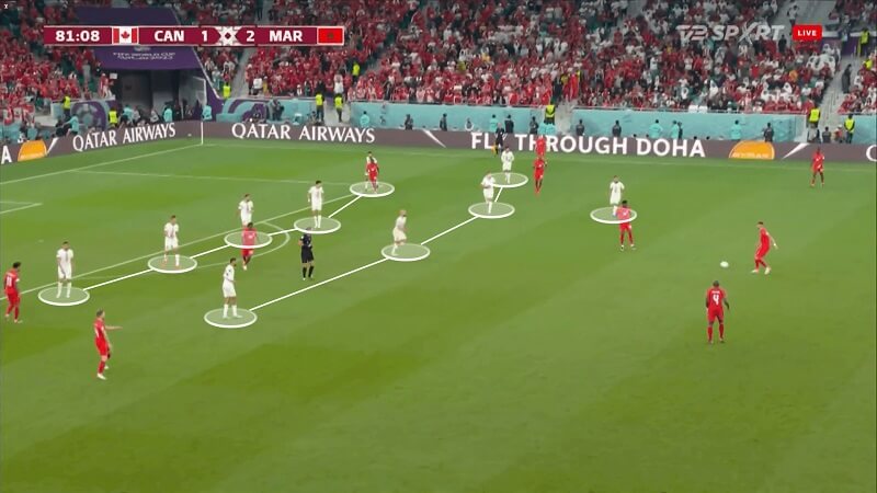 Sau khi HLV John Herdman cho Canada chuyển sang cấu trúc 3 trung vệ, Ma Rốc đối diện với một vấn đề mới. Nhưng ý thức vị trí và khả năng đổi mục tiêu theo kèm của Hakim Ziyech và các đồng đội khiến đoàn quân xứ sở lá phong không thể tạo nên bất cứ cơ hội rõ ràng nào. Đến cuối trận, Regragui xoay thành sơ đồ 5-4-1, qua đó bảo toàn thắng lợi.