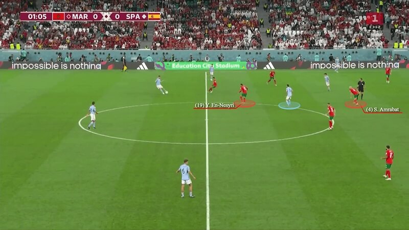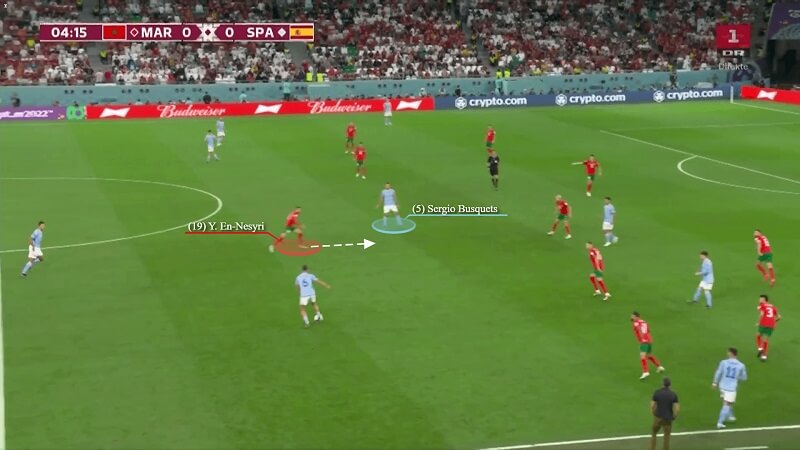 Tương tự như trận gặp Croatia, En-Nesyri điều tiết hướng di chuyển của mình để che đường bóng tới Sergio Busquets – trái tim của La Roja. Nhưng không chỉ như thế, ở phía sau, Amrabat cũng quan sát tình hình, tạo thành thế gọng kìm hướng vào tiền vệ mang áo số 5.