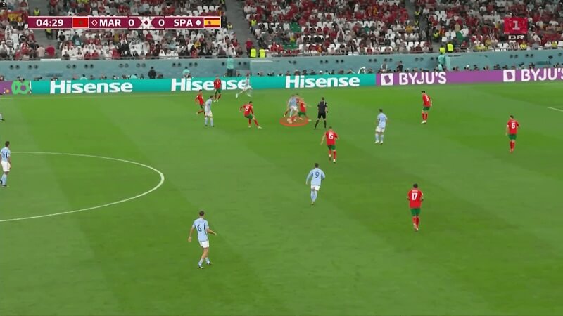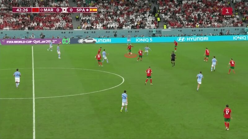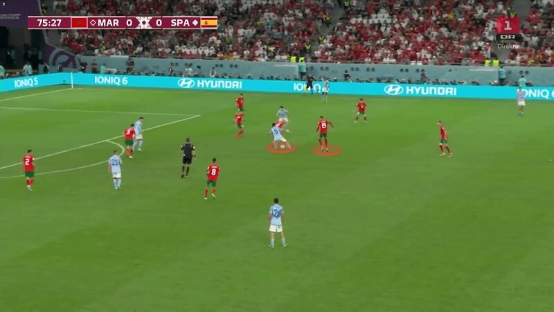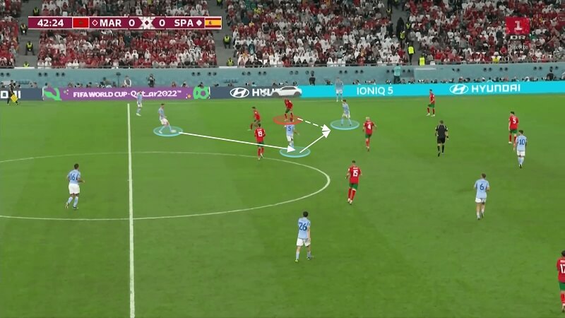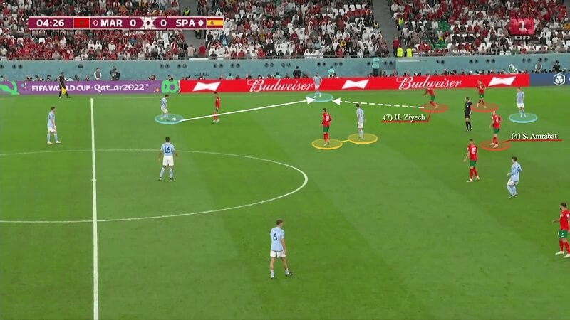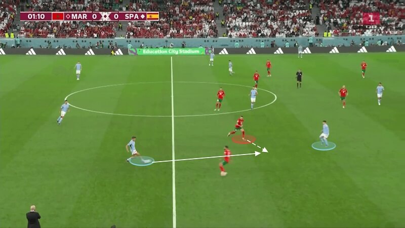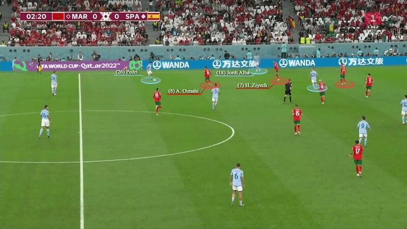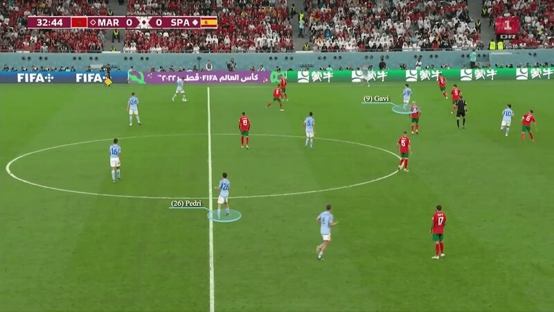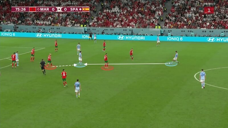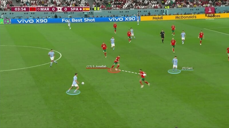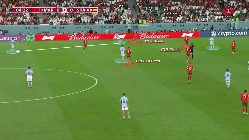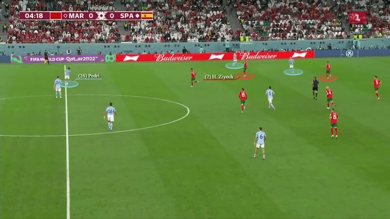 Bước tiếp theo là kiềm tỏa Pedri và Gavi. Nếu hoàn thành nhiệm vụ này, Morocco sẽ khóa được hướng lên bóng ở bên trái và phải.