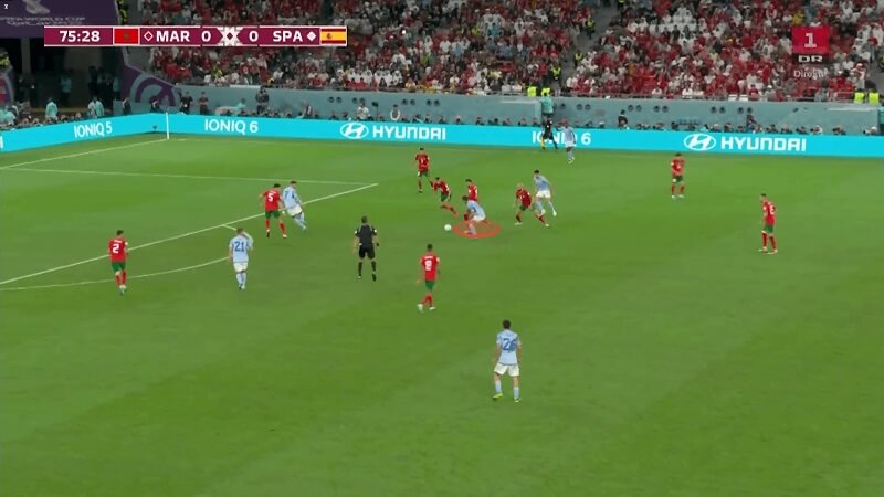 Vài giây sau đó, Tây Ban Nha thử công phá thêm một lần nữa. Lúc này, Hakimi đã trở về vị trí ban đầu, còn Ziyech di chuyển ra cánh. Pedri đưa bóng tới Alba và hậu vệ này quyết định đập nhả cùng Olmo.