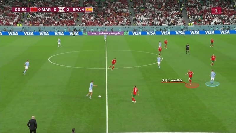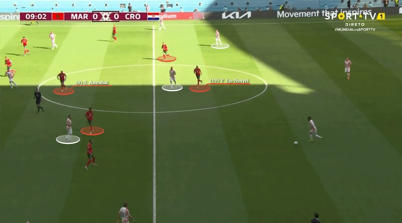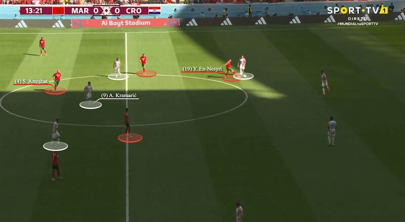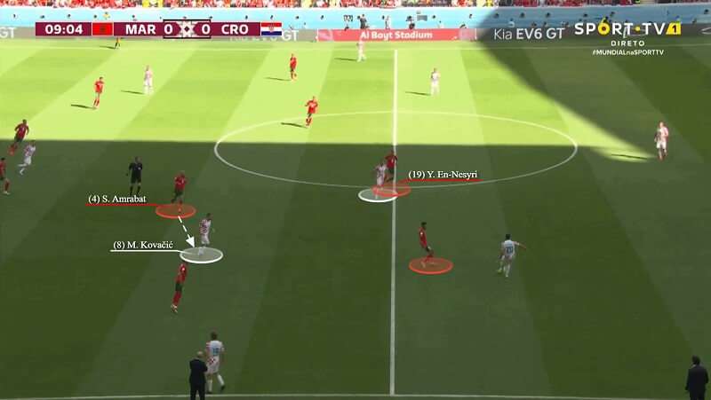 Khi Morocco muốn pressing quyết liệt hơn, họ chuyển đổi cấu trúc một cách mượt mà nhờ vào vai trò tự do của Amrabat. Trong ví dụ dưới đây, Ounahi từ thế đang theo sát Kovacic đã quyết định bước lên để tạo sức ép cho Josko Gvardiol (trung vệ đang giữ bóng bên phía Croatia). Thấy thế, Amrabat dạt sang phải hòng thay Ounahi kèm Kovacic. En-Nesyri tất nhiên vẫn để ý tới Brozovic. Rốt cuộc, Gvardiol phải chuyền về.
