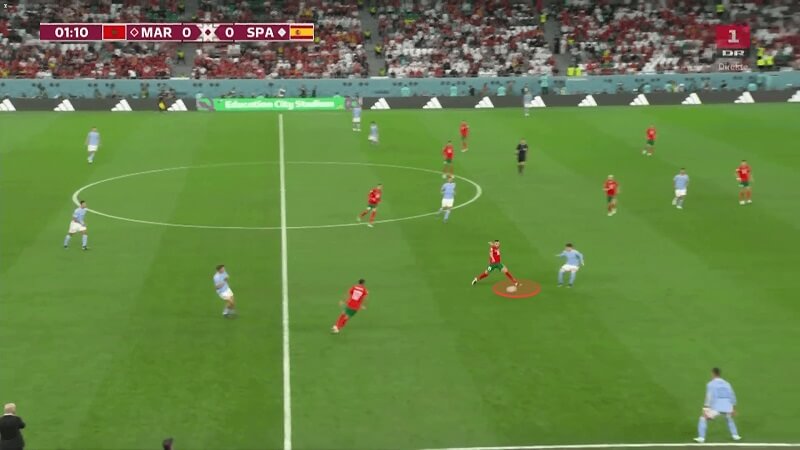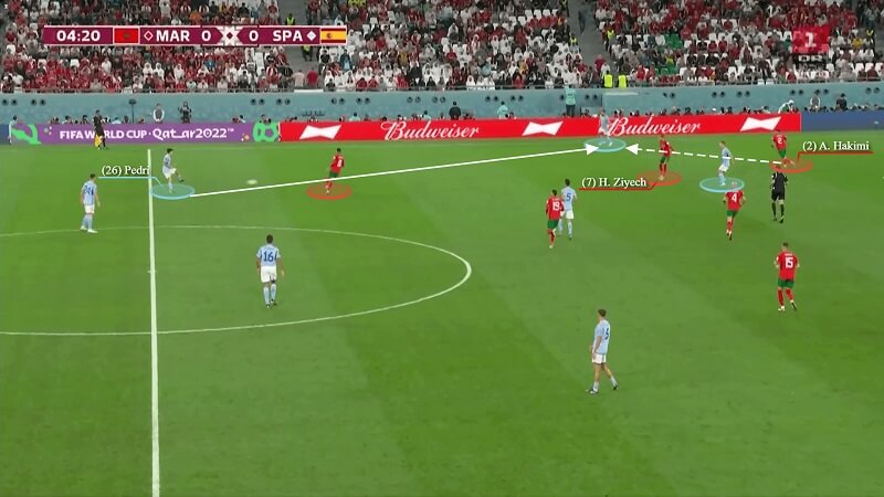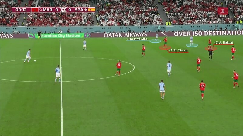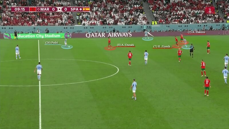 Ở cánh đối diện, Ma Rốc có kế hoạch ứng phó với khả năng hoán đổi vị trí của Tây Ban Nha. Khi Pedri lùi xuống vị trí giống như một hậu vệ trái, Ounahi mới là người dâng lên chứ không phải tiền vệ cánh Ziyech. Thay vào đó, ngôi sao thuộc biên chế Chelsea lùi xuống hỗ trợ Achraf Hakimi, giúp đồng đội không bị rơi vào thế một đấu hai với Jordi Alba và Dani Olmo.