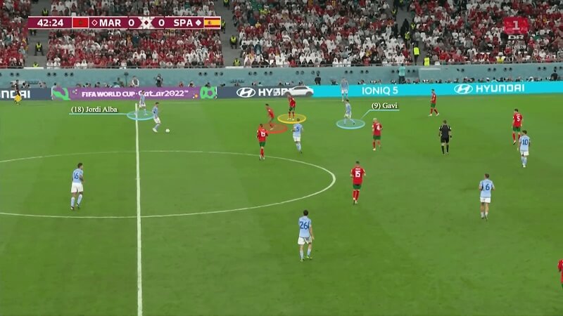 Morocco cũng thay đổi theo. Do Alba đứng phía dưới, Ziyech (vòng tròn màu vàng) chú trọng hơn vào việc giúp Ounahi (vòng tròn màu đỏ) phòng ngự trước Gavi.