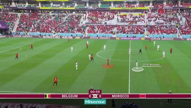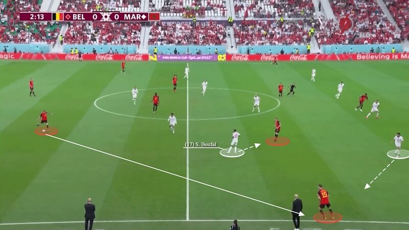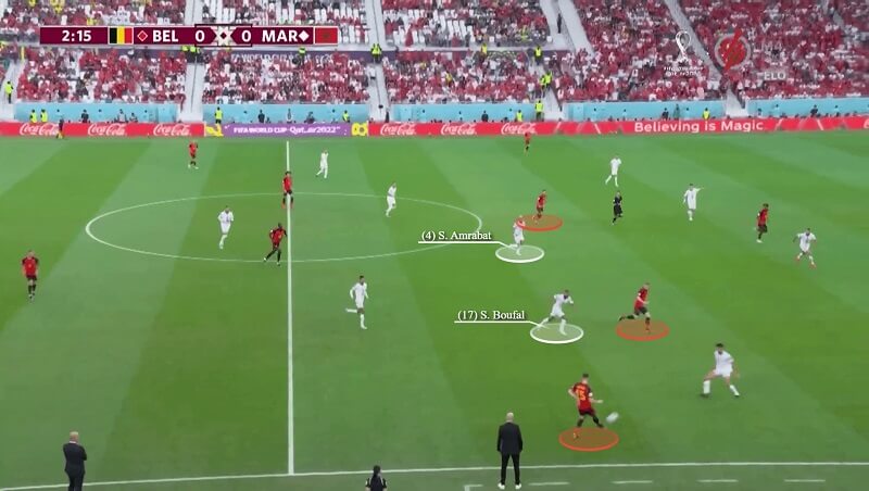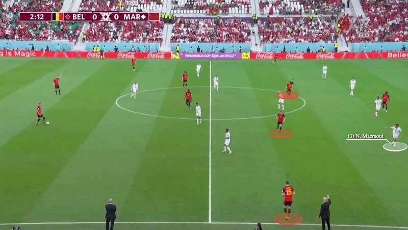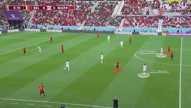 Bỉ muốn dùng hai hậu vệ cánh (wing-back) nhằm tạo khoảng trống cho De Bruyne và Hazard, nhưng Ma Rốc có sẵn phương án phản đòn. Khi Thomas Meunier dâng cao, Mazraoui buộc phải bỏ De Bruyne lại nhằm ngăn chặn số 15 bên phía ĐT Bỉ.