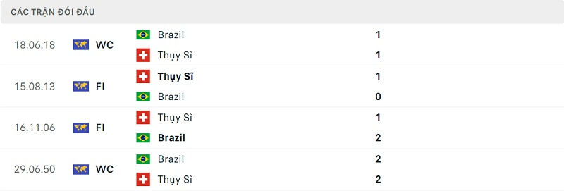 Thành tích đối đầu Brazil vs Thụy Sĩ: